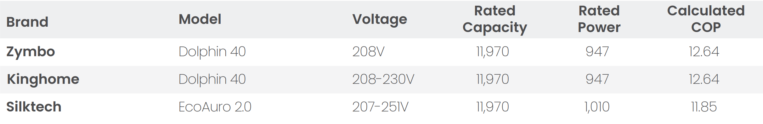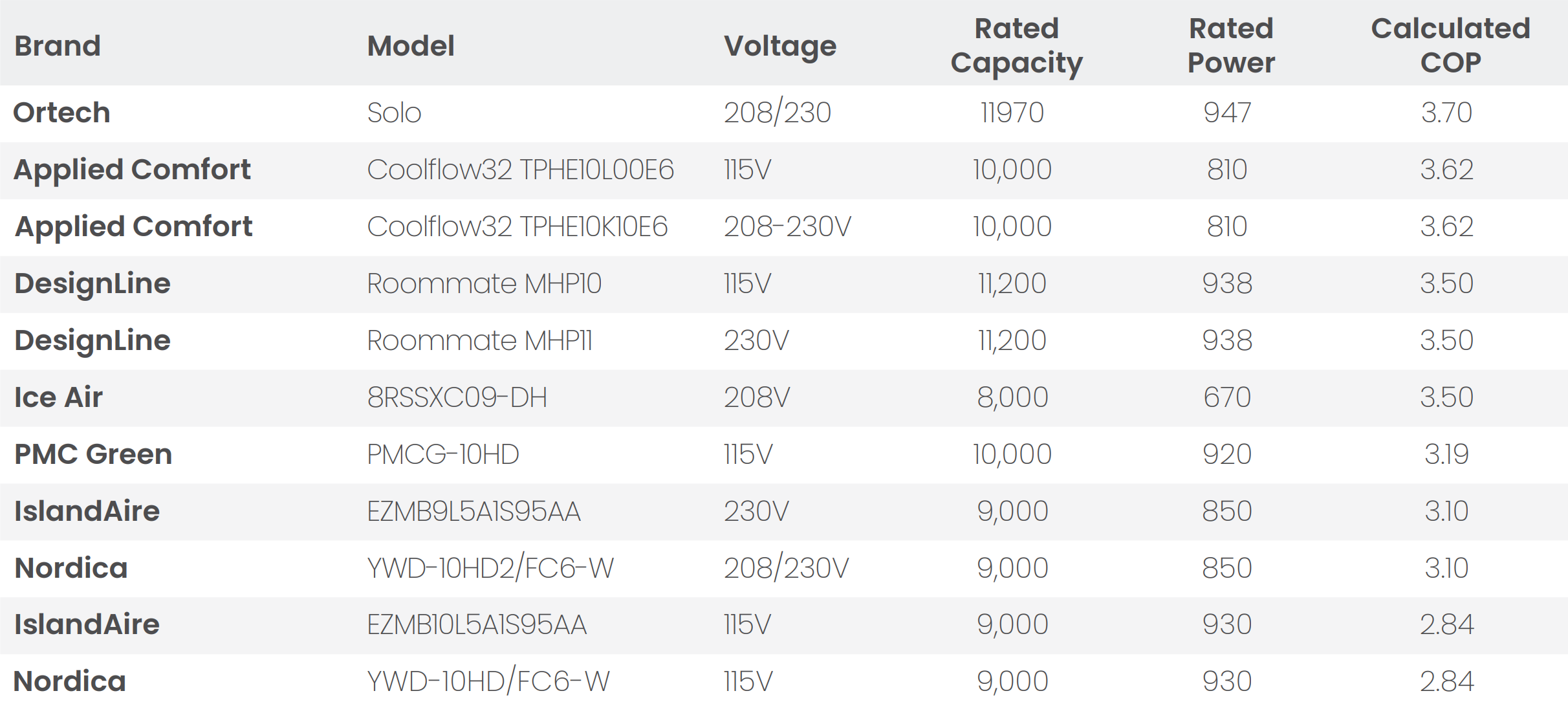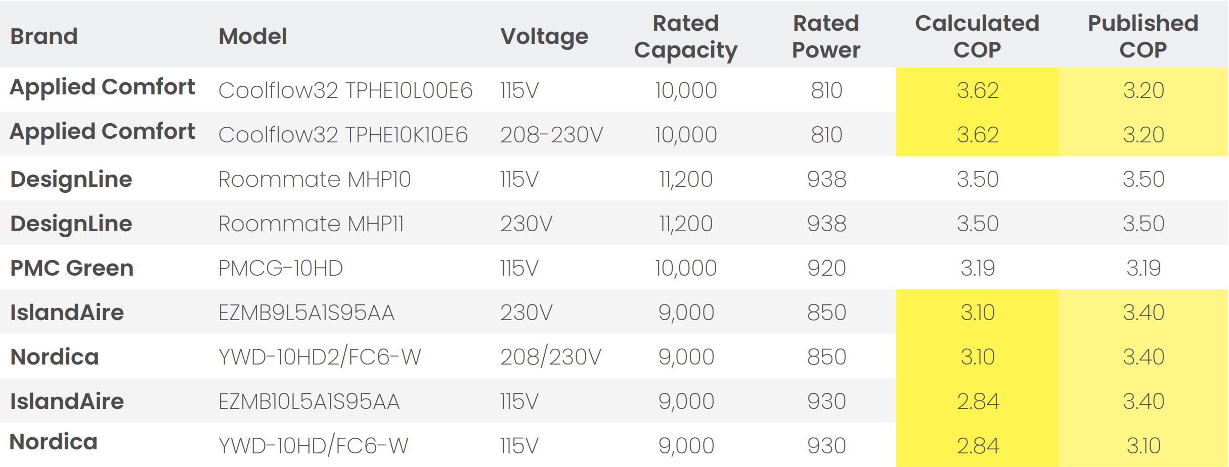 The three brands that publish an HSPF2 all conflict with the data. Does it make sense that Nordica, the manufacturer, claims a 7.5 HSPF2 based on 9,000 BTU, and Ice Air only achieves an extra half point to 8 SEER2 despite losing 1,000 BTU of capacity? This is especially absurd when ICE Air’s COP is 3.5, and Nordica’s is only 2.84? Or even better: are we to believe that Ortech somehow has an 8.29 HSPF2 with 11,970 BTU? These numbers defy basic thermodynamics.